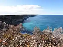 El litoral de la Gran Bahía Australiana se caracteriza por sus acantilados (de hasta 60 metros o 200 pies de altura), playas para practicar el surf y plataformas rocosas, ideales para la observación de ballenas.[9], una actividad muy popular durante el invierno del hemisferio sur, cuando un número cada vez mayor de ballenas francas australes migra a la región desde sus zonas de alimentación en verano en el Antártico. Las ballenas llegan a la región de la bahía, especialmente en la bahía Head of Bight, para parir y reproducirse, y no se alimentan hasta que regresan al Antártico[10] Su número se vio gravemente mermado por la caza de ballenas, sobre todo durante el siglo XIX, pero desde entonces se ha recuperado en cierta medida.[11]