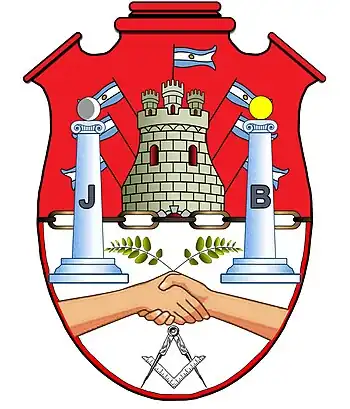 La porción inferior se une a la superior por medio de los eslabones de una gruesa cadena metálica, que representa lo que los masones llaman "cadena de unión", la que habitualmente se realiza dentro de los templos en donde los miembros de la hermandad se toman de las manos. Este simbolismo se repite más abajo con las manos de dos hombres enlazadas. Las dos columnas, una solar y la otra lunar, representan la fuerza y la sensibilidad. También simbolizan las columnas del atrio del Templo de Salomón, que flanquean las puertas de todos los templos masónicos. Las dos ramas de acacia, de extrema importancia para los maestros masones, parten desde la unión de las manos, hacia la base de ambas columnas. Al pie del escudo, se entrecruzan una escuadra y un compás, los símbolos más reconocidos de la Masonería.