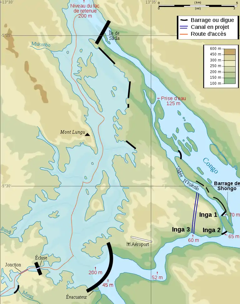 Un embalse, el embalse de Shongo, ha permitido poner bajo agua el Nkokolo. El agua es captada a 10 kilómetros del embalse Inga II, a una altitud de 125 metros, para alcanzar 115 metros al nivel del bief que alimenta los embalses Inga I y Inga II. Un canal de una longitud de algunos centenares de metros, ubicado al oeste del embalse Inga I (45 metros de desnivel, 115-70 metros), alimenta el embalse Inga II (50 metros de desnivel, 115-65 metros). Un canal excavado aguas arriba de las otras dos presas permitiría que la presa Inga III se construyera debajo de las otras dos presas, beneficiándose así de una diferencia de elevación de 55 metros (115-60 metros). Los 3 embalses desarrollarían así una potencia total de 6 275 MW a potencia plena (Inga I e II funcionan actualmente a aproximadamente 20 % de su capacidad, y Inga III no existe todavía).[2]