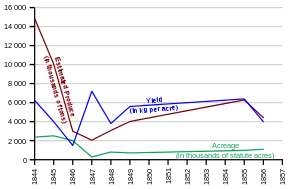 Producción de patata durante la Gran Hambruna.[27] Nota: los años 1844, 1845, 1846, y 1848 están extrapolados.