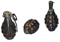 ![]() De izquierda a derecha: F1 seccionada con espoleta M1916 Billant, carcasa de F1 y F1 con espoleta de impacto. | ||