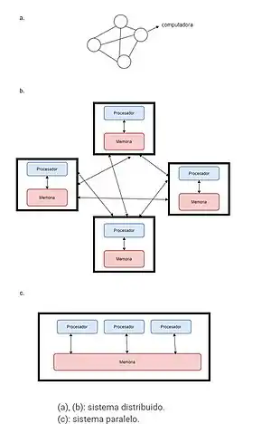 La figura que se encuentra a la derecha ilustra la diferencia entre los sistemas distribuidos y paralelos. La figura a. es un esquema de un sistema distribuido, el cual se representa como una topología de red en la que cada nodo es una computadora y cada línea que conecta los nodos es un enlace de comunicación. En la figura b) se muestra el mismo sistema distribuido con más detalle: cada computadora tiene su propia memoria local, y la información solo puede intercambiarse pasando mensajes de un nodo a otro utilizando los enlaces de comunicación disponibles. En la figura c) se muestra un sistema paralelo en el que cada procesador tiene acceso directo a una memoria compartida.