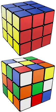 El grupo del cubo de Rubik es un grupo que representa la estructura del rompecabezas mecánico llamado cubo de Rubik. Cada elemento del conjunto corresponde a un movimiento del cubo, que es el efecto de cualquier secuencia de rotaciones de las caras del cubo. Con esta representación no solo se puede representar cualquier movimiento del cubo, sino también cualquier posición del cubo, detallando los movimientos del cubo necesarios para rotar el cubo resuelto a esa posición. De hecho, con la posición resuelta como punto de partida, existe un correspondencia uno a uno entre cada una de las posiciones posibles del cubo y los elementos de .[1][2] El grupo de operaciones es la composición de movimientos del cubo, correspondiente al resultado de realizar un movimiento del cubo tras otro.