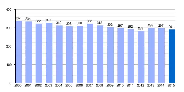 | Gráfica de evolución demográfica de Guadalén[3] entre 2000 y 2015 |