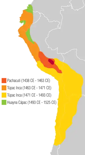 Al morir el inca Pachacútec en 1471, Túpac Yupanqui se hizo cargo del trono. Durante su reinado se realizó una expedición que inició recorriendo la meseta del Collao sometiendo a los collas sublevados[3] y conquistando a los chichas aproximadamente en 1478. Al año siguiente avanzó sobre la provincia de Jujuy y de acuerdo a las crónicas hacia 1480 dirigió la campaña en el actual noroeste argentino contra los diaguitas, y en Cuyo contra los huarpes de la provincia de San Juan y del noroeste de la provincia de Mendoza. Las fechas datadas por radio carbono en la provincia de Mendoza, dan sin embargo fechas anteriores de ocupación inca en Argentina.