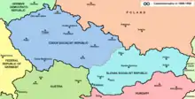 A modo de compromiso, el 29 de marzo de 1990 el Parlamento checoslovaco acordó que el nombre completo del país sería "República Federativa Checoslovaca", con lo que se reconocía explícitamente que era una federación. Este nombre se escribiría sin guion en checo (Československá federativní republika), y con guion en eslovaco (Česko-Slovenská federatívna republika)..[2][3] Una futura ley de símbolos nacionales debía formalizar la versión eslovaca del nombre.