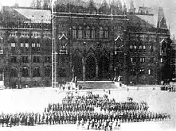 El 1 de diciembre de 1918, los representantes electos rumanos de Transilvania proclamaron la unión de la región con Rumania. Más tarde, los sajones de Transilvania y los suabos del Banato también apoyaron la unión.[20][21] En diciembre de 1918, las unidades rumanas llegaron a la línea del río Maros (Mureş). Esta fue una línea de demarcación acordada por los representantes de las potencias aliadas y Hungría en el Armisticio de Belgrado. Al mismo tiempo, las unidades del ejército alemán, bajo el mando del mariscal August von Mackensen, se retiraron al oeste.