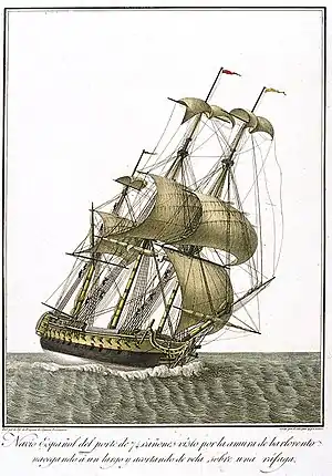 En 1797 bajo el mando del capitán de navío Nicolás Estrada y Posada, fue asignado en 1798 a la escuadra del teniente general José de Mazarredo Salazar, que quedó bloqueada en Cádiz por la inglesa de John Jervis. Al mando del capitán de navío José Justo Salcedo consiguió partir rumbo a América, de donde regresó con recursos monetarios.