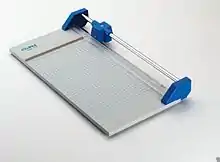 Las guillotinas para papel vienen en distintos tamaños, por lo general desde unos 30 cm de largo en las que se utilizan para trabajos de oficina hasta 85 cm (la longitud del lado de una hoja A1) en los talleres de diseño. Por lo general la superficie posee grabado o impresa una grilla cuadrangular de 1 cm de lado, y puede tener una regla en su parte superior. Por lo menos debe tener un borde plano contra el cual el usuario alinea el papel en ángulo recto antes de accionar la cuchilla de corte. Por lo general es relativamente pesada, de forma tal que no se desplace al utilizarla.