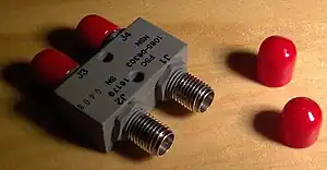 En radio frecuencias se llama híbrida, a un circuito de cuatro puertas, numeradas 1, 2, 3 y 4, de tal modo que la potencia incidente por 1 se reparte entre las puertas 2 y 3, normalmente a partes iguales, quedando la 4 aislada. Las híbridas se caracterizan por la relación de fase entre las puertas 2 y 3. Así tenemos híbridas de 90°, de 180°, etc. Existen diversas realizaciones en distintas tecnologías, según la frecuencia de trabajo: en guía de ondas, microstrip y bobinas.