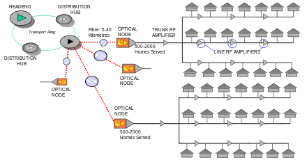 En lugar de eso, la fibra óptica termina en un dispositivo de la red llamado puerta de enlace (gateway), el cual contiene, al menos, un transformador óptico (normalmente, dos) que permite la transición de la señal a la red de cable coaxial.