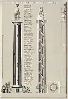 Junto al hôtel se construyó en 1574 una torre de 31 metros de altura con una plataforma enjaulada, ahora llamada columna de los Medici.[9] Es posible que la columna fuera utilizada para observaciones por el astrólogo personal de la reina, el florentino Cosimo Ruggeri, supuesto autor de la predicción ya mencionada. La escalera interior conduce a una plataforma que puede albergar a tres personas y está coronada por una jaula de hierro. Se piensa que antes una balconada rodearía la parte superior.[10] La solitaria columna dórica, conocida como Colonne de l'Horoscope, estaba en el patio.[8] La columna también parece haber tenido un significado conmemorativo.[11] Tallados con espejos rotos, nudos de amor rotos y las letras «C» y «H» entrelazadas, todos símbolos del dolor de Catalina por la pérdida de su marido, están incrustadas en las estrías.[7] A la izquierda de la escalera de la torre había un vestíbulo, la habitación más grande del complejo. El ala central, dibujada por Silvestre desde el jardín, se extendía por su lado norte.[8]
