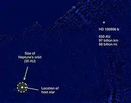 HD 106906 b es un planeta extrasolar que orbita la gran estrella HD 106906, situada dentro de la constelación de Crux.[1] Este planeta es un gigante de gas que se estima en aproximadamente once veces la masa de Júpiter y orbita su estrella a una distancia de casi 110.000 millones de kilómetros, o alrededor de 738 veces la distancia entre la Tierra y el sol.[2] La gran separación de este planeta de su primaria ha ganado una considerable atención de la comunidad astronómica, ya que es mayor de la que se creía posible en función en la comprensión actual de la hipótesis nebular.[3]