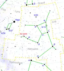 | HD 164595[4] | 18h 00m 38.9s | +29° 34′ 19″ | 91 | G2V | 5,790 | −0.06 | 4.5 | [5] |