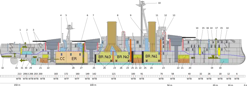 • Cinturón: 102–279 mm • Cubierta: 19–76 mm • Barbetas: 102–279 mm • Torretas: 76–305 mm • Torre de mando: 279 mm • Mamparos: 203 mm | |
