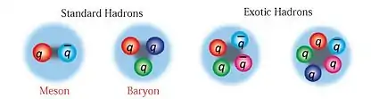 Los hadrones se dividen en dos grandes familias: bariones, formados por un número impar de cuarks (normalmente tres cuarks) y mesones, formados por un número par de cuarks (normalmente dos cuarks: un cuark y un anticuark).[2] Protones y neutrones (que constituyen la mayor parte de la masa de un átomo) son ejemplos de bariones; piones son un ejemplo de mesón. En los últimos años se han descubierto hadrones exóticos que contienen más de tres cuarks de valencia. Un estado tetraquark (un mesón exótico), denominado Z(4430)-, fue descubierto en 2007 por el Experimento Belle[3] y confirmado como resonancia en 2014 por la colaboración LHCb.[4] Dos estados pentaquark (barión exótico), denominados P+