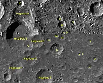 Por convención estos elementos se identifican en los mapas lunares colocando la letra en el lado del punto central del cráter más cercano Hagecius.