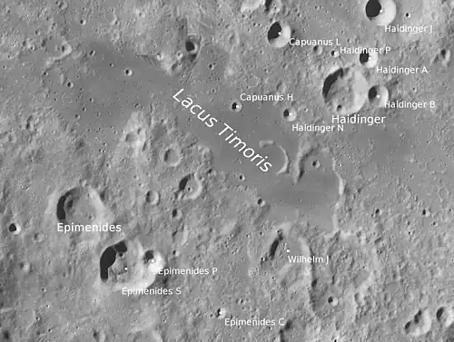 Haidinger es un cráter de impacto situado en la parte suroeste de la Luna. Justo al suroeste del cráter se halla el pequeño mar lunar denominado Lacus Timoris. Haidinger se encuentra al noroeste del cráter Wilhelm y al este de Hainzel, de aspecto irregular.