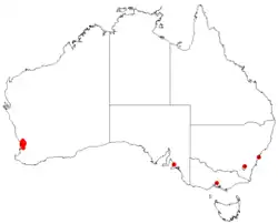 Se asocia específicamente con suelos lateríticos y afloramientos de granito en los bosques de Jarrah en los Montes Darling.[1]