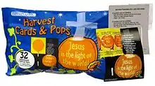 255. Woods, Robert (2013). Evangelical Christians and Popular Culture. ABC-CLIO. p. 239. ISBN 978-0-313-38654-1. «Los evangélicos han encontrado en la Navidad y la Pascua la oportunidad de utilizar dulces cristianos para reinyectar la religión en estas fiestas tradicionalmente cristianas y reclamarlas como propias. Cada vez más han empezado a utilizar Halloween, la fiesta más centrada en los dulces, como una oportunidad para la evangelización. Las "Harvest Seeds" de Scripture Candy -caramelos de maíz en todo menos en el nombre-, que vienen en pequeños paquetes con versículos bíblicos, son algunos de los muchos caramelos creados con este fin.»