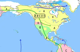 - América Septentrional: Es el haplogrupo predominante, especialmente en los esquimales y pueblos na-dené. La frecuencias más altas están en el Canadá en los na-dené/atabascas como los haida con 95% y dogrib 90-100%.[10] En los inuit tienen frecuencias del 62-97%: en las islas de Alaska 75%, Canadá 87.5% y Groenlandia 96%.[6] Es haplogrupo predominante en los pueblos bellacoola, navajo, siux, lakota, anishinaabe, ojibwa, kikapú, etc. Es minoritario en aleutas (28.5%).