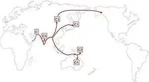 - C1b2a1c2 (FT12310^^) en Indonesia y en nativos de Nueva Zelanda (maoríes), Samoa, islas Cook, Hawái[2]