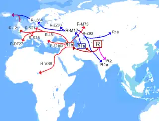 Las mayores frecuencias están en Europa, donde R1 es predominante. R está muy extendido en el subcontinente indio, Asia Central, Cáucaso, Cercano Oriente y Sinkiang.
