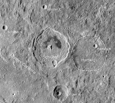 Hartwig es un cráter de impacto que se encuentra cerca de la extremidad occidental de la Luna. Está unido al borde oriental del prominente cráter Schlüter, al noreste de la cadena montañosa denominada Montes Cordillera, que rodea el Mare Orientale. Al este-noreste de Hartwig aparece el cráter más grande Riccioli.
