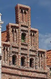 Wikimedia Commons alberga una categoría multimedia sobre Hastial escalonado.- Roper Gate, an example of the use of crow-stepped gable