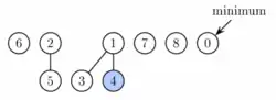 En la tercera fase, comprobamos cada una de las raíces restantes y encontramos el mínimo. Esto cuesta O(log n) y el potencial no cambia. El tiempo medio de ejecución amortizado para extraer el mínimo es por consiguiente O(log n).