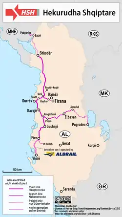 La infraestructura de HSH se extiende al este a Pogradec, al sur a Vlorë y al norte a Shkodër. También hay una línea ramal a la capital Tirana. La red se extendió más allá Shkodër en la década de 1980 en lo que hoy es Montenegro, a través de la ciudad fronteriza albanesa de Han i Hotit, pero esa sección del sistema es sólo para carga. Tampoco hay conexión ferroviaria física entre Albania y la vecina Macedonia, así como con Grecia.