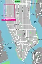 - Jacobson, Aileen. "Living In Hell’s Kitchen: Where East Village Grit Meets the Artsy West Side", The New York Times, November 11, 2020. Accessed November 15, 2020. "Stretching from Eighth Avenue to the Hudson River (busy commercial thoroughfare to sublime park) and from West 59th to West 41st Streets (sleek Time Warner Center to scruffy Port Authority bus terminal), Hell’s Kitchen is a jumble of contrasts."