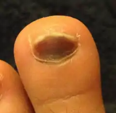 El hematoma subungueal es una acumulación de sangre debajo de la uña ocasionado generalmente por una hemorragia tras un golpe en la falange distal de un dedo de la mano o del pie. La sangre en lugar de salir al exterior se acumula debajo de la uña y le da a esta un aspecto negro característico.[1]