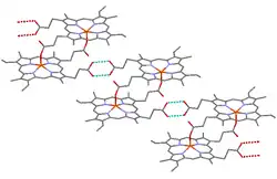 Los cristales de β-hematina están formados por dímeros de moléculas de hematina que, a su vez, están unidos por enlaces de hidrógeno que forman estructuras más grandes. En estos dímeros, un enlace coordinado de hierro - oxígeno une el hierro central de la una hematina con el oxígeno de la cadena lateral de carboxilato de la hematina adyacente. Estos enlaces recíprocos de hierro-oxígeno son inusuales y no se han observado en ningún otro dímero de porfirina. La β-hematina puede ser un dímero cíclico o un polímero lineal,[30] nunca se ha encontrado una forma polimérica en la hemozoína, lo que descarta que la enzima hemo-polimerasa produce hemozoína.[31]