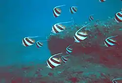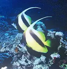 El pez coral o pez estandarte de aleta larga (Heniochus acuminatus), es un pez tropical perciforme de la familia Chaetodontidae.