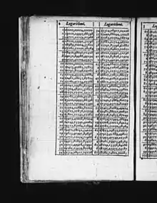 Una página de la obra de Henry Briggs de 1617 Logarithmorum Chilias Prima mostrando los logaritmos en base-10 (o comunes) de los enteros entre 1 y 67 con catorce lugares decimales.