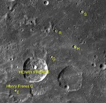Por convención estos elementos se identifican en los mapas lunares colocando la letra en el lado del punto medio del cráter que está más cercano a Henry Frères.