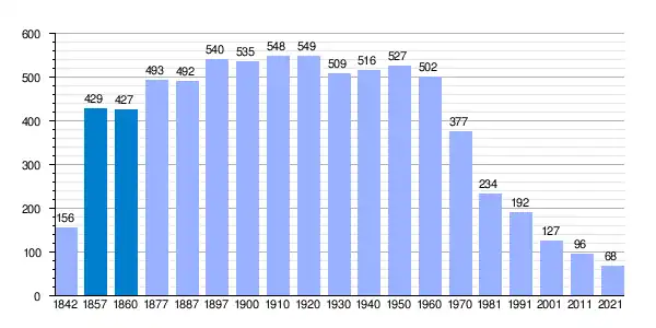 | Gráfica de evolución demográfica de Herguijuela de Ciudad Rodrigo[7] entre 1842 y 2021 |