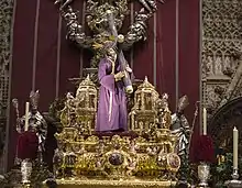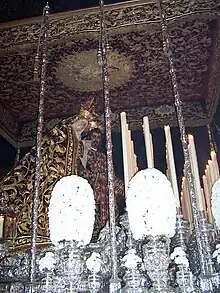 El paso del Señor se contrató con el imaginero Francisco Antonio Gijón en 1688 y fue entregado en 1692. Aunque las tallas y los dibujos eran de Gijón, puede que la arquitectura del paso fuera obra de Bernardo Simón de Pineda. En las cuatro esquinas cuenta con águilas bicéfalas, que hacen referencia a una interpretación de san Jerónimo del ascenso de la oración y el descenso de la Divina Gracia. Bajo las 4 águilas hay 4 cartelas que recopilan escenas bíblicas: la destrucción del templo por Sansón, la entrada de los animales en el arca de Noé, Moisés tocando con la vara la peña y el retorno del hijo pródigo. Las cartelas de los laterales muestran a Jesús en diversos momentos de la Pasión.[29] Es curioso que Serrano Ortega, en 1895, no menciona tres cartelas que existen de la Pasión y sí tres que faltan de David contra Goliat, Sansón cargando con las puertas de Gaza e Isaac con la leña del sacrificio. También figuran en las andas cuatro relieves pequeños que representan a San Mateo, San Juan, San Jerónimo y San Agustín. Los seis ángeles de virtudes que coronan el canasto fueron restaurados por Blas Molner en 1776. También hizo una leve intervención en la talla Bernardo Simón de Pineda. El canasto va iluminado con ocho guardabrisas de gran tamaño en las cuatro esquinas e, iluminando a Jesús, hay cuatro faroles realizados por el orfebre cordobés Rafael León en 1908. En 1853 el paso fue restaurado por completo y en 1895 se practicó una pequeña limpieza. Las andas están coronadas por un moldurón perfilando los faldones, realizado en 1969 por Guzmán Bejarano.[29] Es el paso más antiguo de la ciudad.[30] Fue restaurado en 1853 por Gabriel de Astorga.[31] En 2012 fue restaurado por el Instituto Andaluz del Patrimonio Histórico de la Junta de Andalucía.[32]