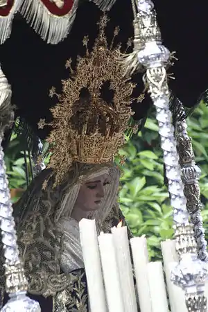 Es una dolorosa que va en paso de palio. Tiene la cabeza inclinada hacia su derecha y mirada baja, con gran expresión dolorosa. Fue realizada en 1810 por Juan de Astorga. Es la única Virgen dolorosa en Sevilla cuyo rostro está realizado en papelón, con un gran valor artístico.