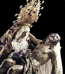Las dos imágenes que componen este grupo están talladas por separado. El Cristo posee todas las características de la obra de Juan de Mesa en este campo, es decir, un rostro en el que se observan todos los ademanes de una persona que acaba de fallecer y además con una muerte violenta, como fue la de Jesucristo. El brazo izquierdo se encuentra en una posición natural teniendo en cuenta la situación. Es el brazo derecho el que presenta una posición algo más antinatural, quizá reflejo del deseo de la madre que lo está sosteniendo de obtener un abrazo del cuerpo sin vida de su hijo. Este detalle hace creer a algunos expertos que quizás la figura del Cristo no fuera tallada ex profeso para este conjunto si no para un crucificado este detalle está casi confirmado .