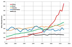 La clasificación de la capacidad hidroeléctrica es por la producción de energía anual real o por la potencia nominal de la capacidad instalada. En 2015, la energía hidroeléctrica generó el 16.6% de la electricidad total del mundo y el 70% de toda la electricidad renovable.[1] La energía hidroeléctrica se produce en 150 países y la región de Asia y el Pacífico generó el 32% de la hidroelectricidad global en 2010. China es el mayor productor de energía hidroeléctrica, con 721 teravatios-hora de producción en 2010, lo que representa alrededor del 17% del uso doméstico de electricidad. Brasil, Canadá, Nueva Zelanda, Noruega, Paraguay, Austria, Suiza y Venezuela tienen una mayoría de la producción interna de energía eléctrica a partir de energía hidroeléctrica. Paraguay produce el 100% de su electricidad de las represas hidroeléctricas y exporta el 90% de su producción a Brasil y Argentina. Noruega produce el 98-99% de su electricidad a partir de fuentes hidroeléctricas.[51]