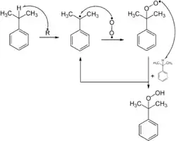 Los compuestos con enlaces C-H alílicos y bencílicos son especialmente susceptibles a la oxigenación.[10] Dicha reactividad se explota industrialmente a gran escala para la producción de fenol mediante el proceso de cumeno o proceso Hock para sus intermedios de cumeno e hidroperóxido de cumeno.[11] Dichas reacciones se basan en iniciadores radicales que reaccionan con el oxígeno para formar un intermedio que extrae un átomo de hidrógeno de un enlace C-H débil. El radical resultante se une al O2, para dar hidroperoxilo (ROO.), Que luego continúa el ciclo de abstracción de átomos de H.[12]