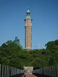 La torre de agua de High Bridge, en Highbridge Park entre las calles West 173rd y 174th, en la parte superior de la cresta en el lado de Manhattan de High Bridge, se construyó entre 1866 y 1872 para ayudar a satisfacer las demandas cada vez mayores del sistema de agua de la ciudad. Los 200 pies (61,0 m) la torre octogonal, que fue autorizada por la Legislatura del Estado en 1863, fue diseñada por John B. Jervis, el ingeniero que supervisó la construcción del Acueducto del High Bridge. El agua fue bombeada 100 pies (30,5 m) a embalse junto a la torre – ahora el sitio de un centro de juegos y piscina pública construido en 1934-1936 – que luego proporcionó agua para elevar los 47 galones americanos (0,2 m³) tanque. Este "servicio alto" mejoró la presión por gravedad del sistema de agua, necesaria debido al mayor uso de inodoros con descarga.[26]