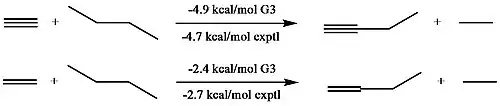 Otro grupo dirigido por Houk et al.,[10] sugirió que los métodos empleados por Rogers y Kistiakowsky eran inapropiados, porque las comparaciones de calor de hidrogenación evaluaban no sólo los efectos conjugativos, sino también otras diferencias estructurales y electrónicas. Obtuvieron -70.6 kcal/mol y -70.4 kcal/mol para la primera y segunda hidrogenación, respectivamente, por cálculos ab initio, lo que confirmó los datos de Rogers. Sin embargo, interpretaron los datos de forma diferente, tomando en cuenta la estabilización por hiperconjugación. Para cuantificar el efecto de hiperconjugación, they designed bellowing isodesmic reactions en el 1-butino y 1-buteno.