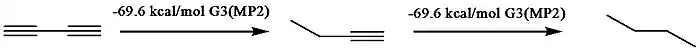 La conjugación del 1,3-butadieno fue evaluado primero por Kistinkowsky, se encontró una contribución conjugativa de 3.5 kcal/mol basándose en la comparación energética de la hidrogenación entre las especies conjugadas y los análogos no conjugados.[8] Rogers et al., quienes usaron el método aplicado por primera vez por Kistiakowsky, reportaron que la estabilización por conjugación del 1,3-butadiino era cero, puesto que la diferencia de ΔhidH entre la primera y segunda hidrogenación era cero. Los calores de hidrogenación (ΔhidH) fueron obtenidos por el método de química cuántica computacional MP2.[9]