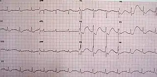 ![]() Un ECG tomado en una persona con niveles bajos de potasio. Se observan los típicos cambios como por ejemplo la depresión del segmento ST, ondas T invertidas, ondas U largas y un aumento en el intervalo PR | ||