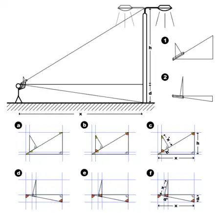 Es conocido desde la Grecia clásica que es posible medir por semejanza de triángulos la altura de un objeto sin necesidad de acceder hasta su punto más alto si se puede medir su sombra.[4] Un simple hipsómetro de escala permite calcular la altura de un edificio o un árbol leyendo la medida de una plomada sobre una regla con la que se apunta a la parte superior de un objeto cuando se conoce la distancia desde el objeto hasta el observador. Los hipsómetros modernos usan una combinación de telémetro láser y clinómetro para medir distancias a la parte superior e inferior de los objetos y el ángulo entre las líneas desde el observador hasta cada uno de estos dos puntos para calcular la altura.