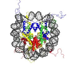 Las histonas son proteínas que empaquetan el ADN en los nucleosomas, siendo responsable de mantener su forma y estructura.[1] Una molécula de cromatina se compone de, al menos, una de cada familia de histonas centrales por cada 100 nucleótidos del ADN.[2] Hasta la fecha se conocen cinco familias de histonas, denominadas, H1, H2A, H2B, H3 y H4.[3] H2A se considera una histona central, así como H2B, H3 y H4. La formación del nucleosoma comienza con la interacción de dos histona H2A, las cuales forman, cada una, un heterodímero con una H2B. El nucleosoma central se completa al sumarse dos heterodímeros H3-H4 para formar un tetrámero.[3]