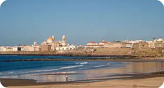 En 1805 la alianza entre Carlos IV y Napoleón provocó la participación española en la guerra naval contra Inglaterra, que se decidió en la batalla de Trafalgar, acontecida en aguas de la costa gaditana y que resultó en la derrota de la escuadra franco-española frente a la flota inglesa.[43] En 1808 las tropas napoleónicas entraron en la península ibérica con el pretexto de invadir Portugal junto al ejército español. Sin embargo, Napoleón aprovechó para derrocar a traición a los gobernantes españoles y apoderarse del país. Ello dio lugar a una insurrección popular y la consecuente guerra de la Independencia, en la que Andalucía tuvo un papel decisivo en la resistencia frente al invasor, con la batalla de Bailén, que fue la primera victoria española sobre los franceses, con el movimiento juntero y con las Cortes de Cádiz, que el 19 de marzo de 1812 proclamaron la primera constitución liberal de España, llamada popularmente la Pepa. La constitución fue jurada por el rey Fernando VII a su vuelta a España pero el monarca no tardó en anularla y restaurar el absolutismo.